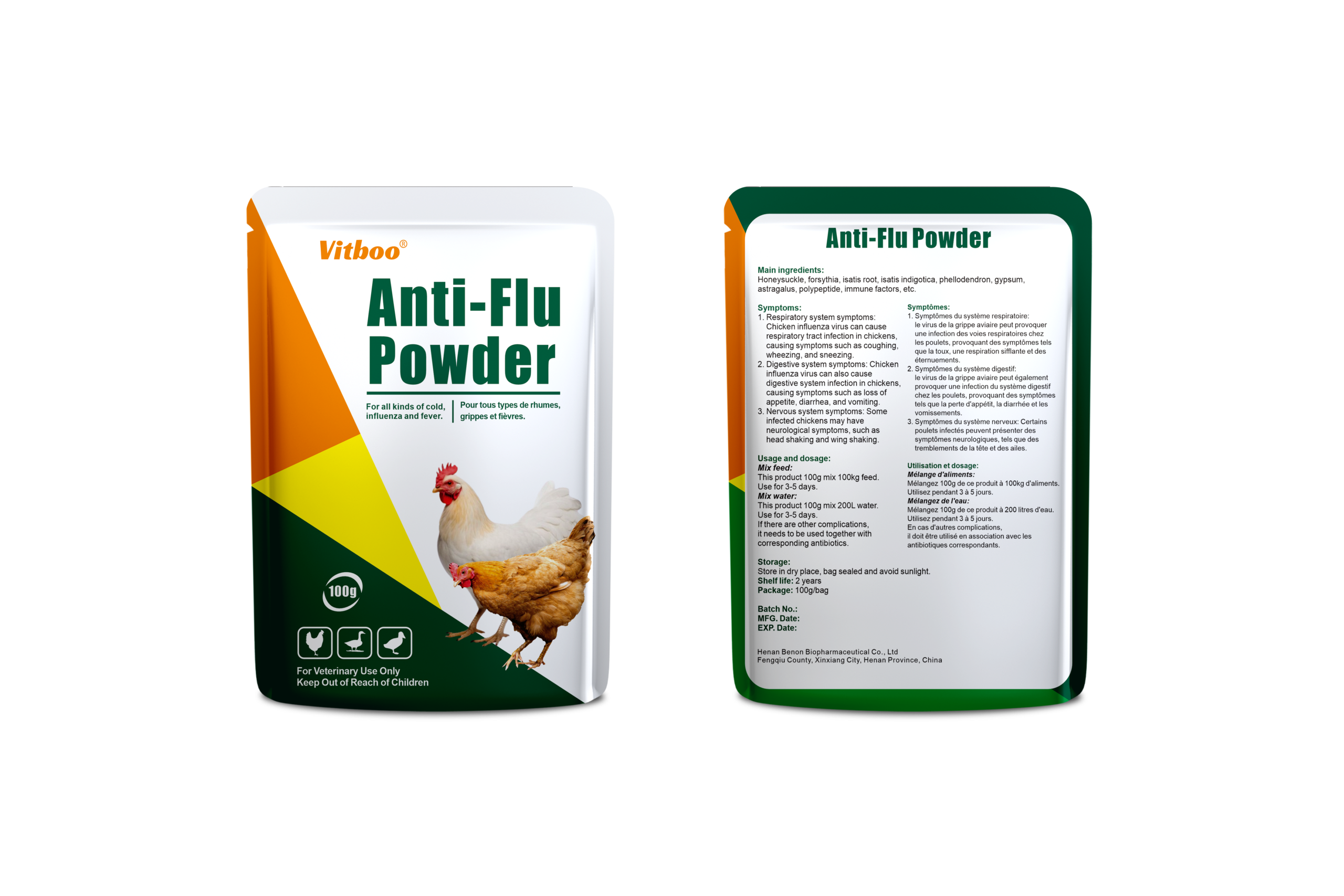 Anti-Flu Powder is a broad-spectrum respiratory treatment formulated to combat avian flu symptoms and viral respiratory infections in poultry and livestock. It strengthens the immune system and helps reduce stress and mortality during flu outbreaks.